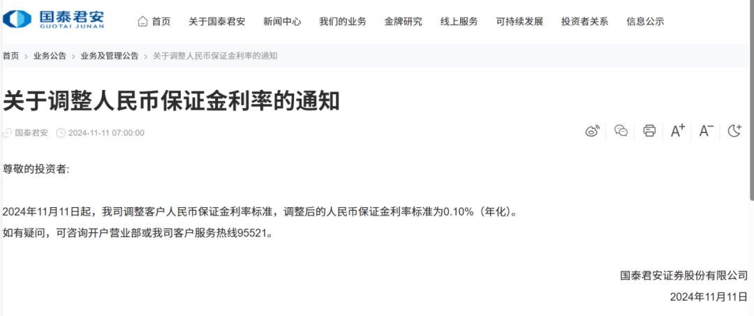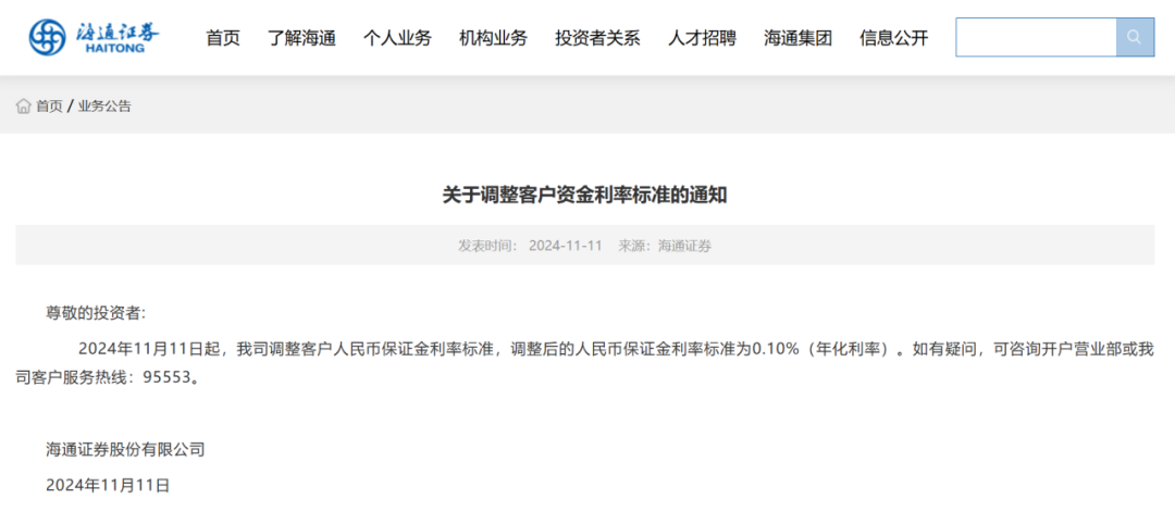 11月11日,海通证券、国泰君安等多家券商公告,11月11日起,公司调整客户人民币保证金利率标准,调整后的人民币保证金利率标准为0.10%(年化)。