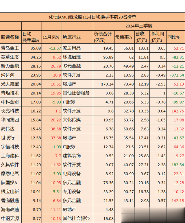 近期股票配资十倍网站,化债(AMC)概念火得一塌糊涂,周末公布了具体的化债规模和实施方案。那么,11月来股市中哪些化债(AMC)概念股表现最活跃呢?