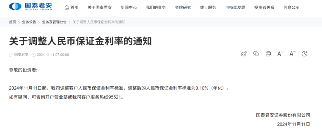 券商新一轮“降息潮”来袭。11月11日股票配资杭州雷曼期货,国泰君安和海通证券均发布关于调整人民币保证金利率的通知,自2024年11月11日起,两家公司调整客户人民币保证金利率标准,调整后的人民币保证金利率标准为0.10%(年化)。